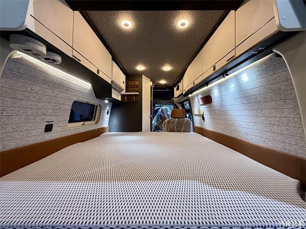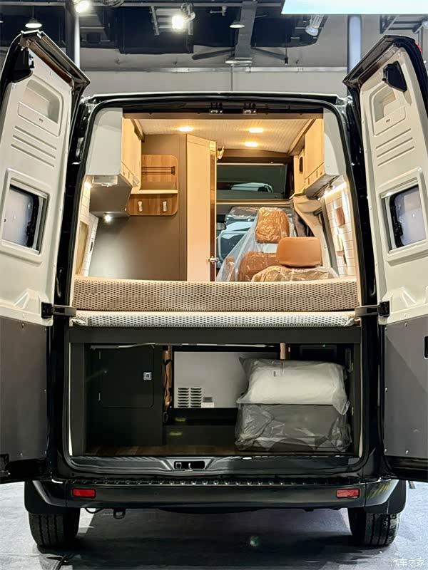 睡卧区位于车尾,床铺可通过巧妙的拓展设计,从初始尺寸变为1.9×1.6m的宽敞床铺,满足双人舒适睡眠。床下预留充足空间用于收纳行李,无论是衣物、鞋子还是旅行用品,都能找到合适的存放位置。打开车尾双开门及床板后,还能形成上下车的通道,十分实用,即使在车内休息时,也能方便地进出车辆。两侧的外凸盲窗设计,不仅增加了床铺的纵向空间,让你在休息时更加舒适自在,还保证了一定的私密性。床边还配备有储物柜、电源接口以及阅读灯,方便存放物品和夜间阅读。