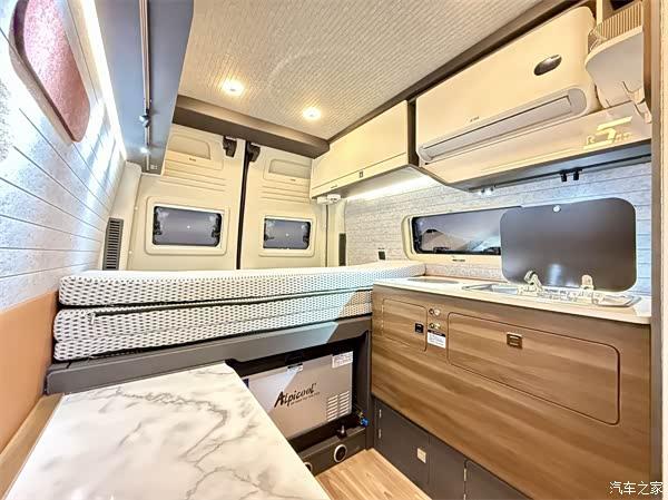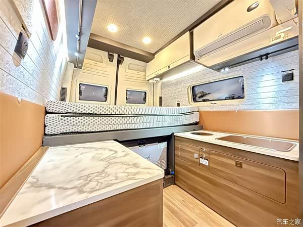 厨房区虽空间紧凑,但“五脏俱全”。配备带翻盖的洗水槽,节省空间,使用时打开翻盖,方便清洗食材与餐具,不用时合上翻盖,让厨房台面更加整洁;水槽旁的延伸桌板,使用时可增大操作空间,方便切菜、烹饪等,不用时则可轻松收起,节省车内空间;800瓦电磁炉火力强劲,满足日常烹饪需求,无论是炒菜、烧水还是煮面,都能轻松应对;平板式光波烤箱一体微波炉,功能多样,既能快速加热食物,又能烤制美味的糕点,为旅途增添更多美食享受;85L双门冰箱,冷藏冷冻功能齐全,满足食材存储需求,让你随时都能享用到新鲜的食物。厨房上部装有吸顶式专用储物柜,方便收纳厨房用品;上方的220V电源系统,可满足小型电器使用。