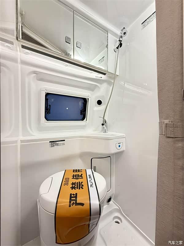 卫生间采用全吸塑开模设计,虽空间不大,但布局合理。内部配备洗手盆、可旋转坐便器、淋浴等设施,满足基本洗漱需求;侧面的小窗户可通风换气,保持卫生间空气清新。独特的设计增大了使用面积,也便于日常的清理打扫,保障了车内的卫生环境。