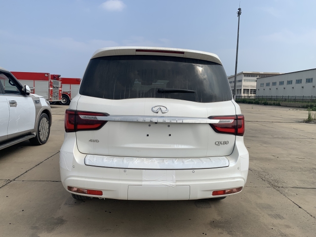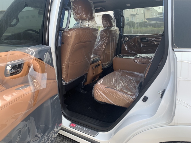 中东版QX80 7座、22轮、全时四驱、LED大灯、前雾灯、环影、倒影、驻车雷达、脚踏板、无钥匙进入、遥启、电尾门、ICC全速智能巡航、盲点辅助、车道保持、导航系统、真皮实木方向盘、方向盘加热、方向盘电动调节、三区空调、电动天窗、真皮仪表盘、实木内饰、真皮座椅、前后排加热座椅、前排通风座椅、前排电动座椅、电动座椅垂直调节、电动后视镜、BOSE音响、无线充电、隐私玻璃 效合库现车 手续齐 白/棕