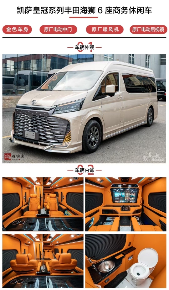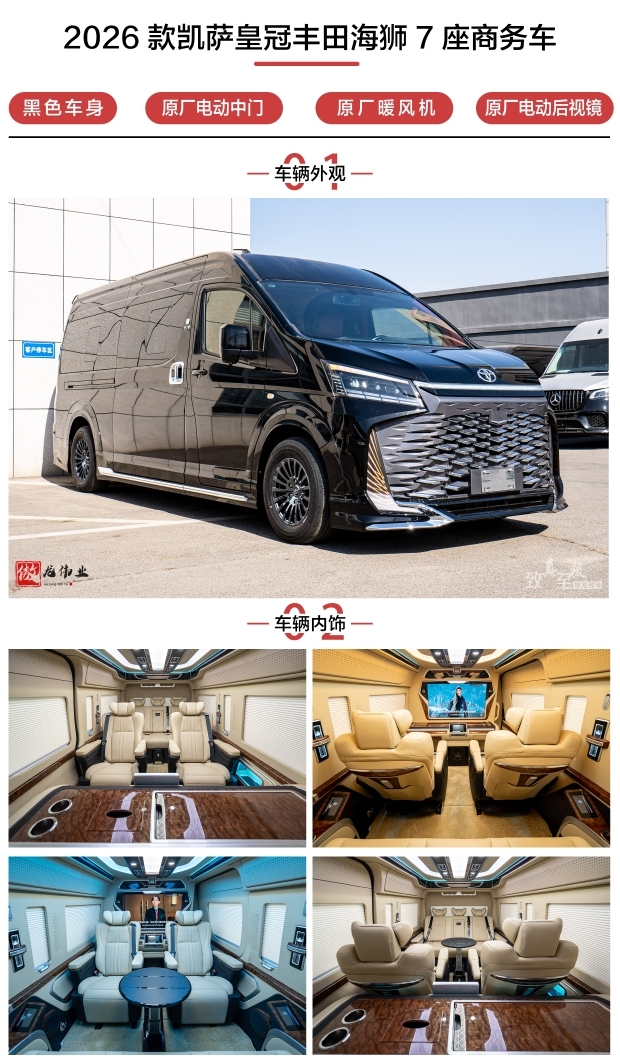 新款丰田海狮凯撒皇冠版改装6座、7座、8座、9座、13座(奢华版、旗舰版、VIP版 超VIP尊贵版、至尊旗舰版) 合格证与座位相符全国上牌! 北京华通丰业丰田海狮(6座/7座/8座/9座10座13座),9座以下丰田海狮可上蓝牌! 实力大厂,值得信任,欢迎来电详询!诚挚邀请您探索丰田海狮的无限魅力。