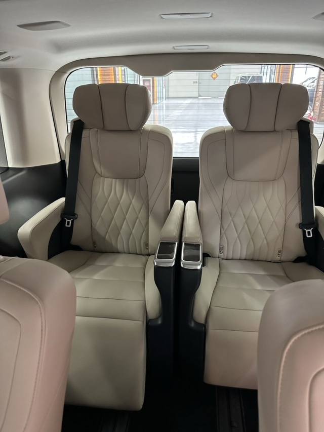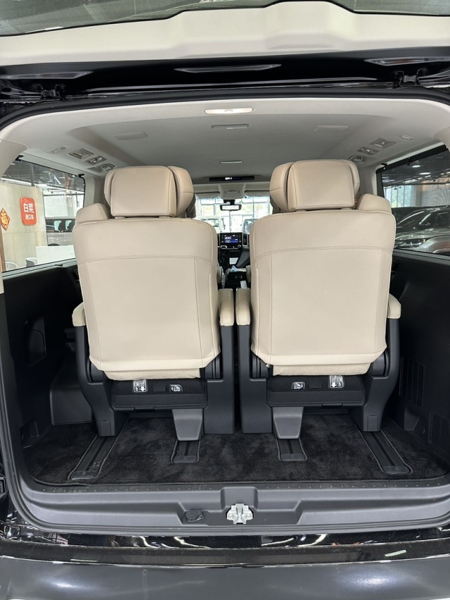 采用"2+2+2"六座行政布局,第二排搭载Ottoman超长滑轨航空座椅(滑移范围达900mm),配备16向电动调节/通风加热/腿托延展功能。第三排魔术座椅可一键形成纯平载物空间(最大容积2110L),车顶标配日本Yazaki星空氛围灯系统(128色可调)。