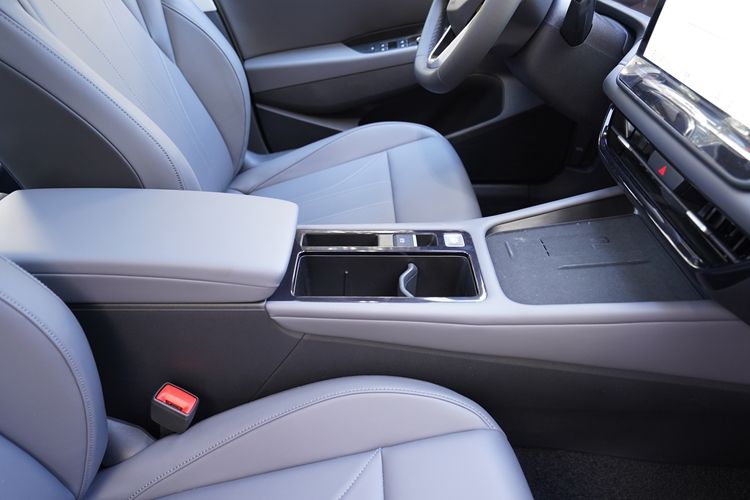 由于采用怀挡,中间平台显得很“干净”。前部是双Type-C接口与手机无线充电(选装),中间区域是启动键、驻车制动键和杯座等,末端是中央扶手,其下的中央储物盒里,内置12伏电源接口。