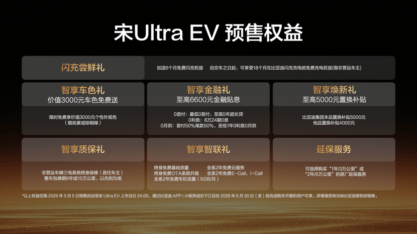 【陕西购车网讯】2026年3月5日,比亚迪王朝B级闪充SUV 宋Ultra EV正式开启预售,全系搭载比亚迪第二代刀片电池及闪充技术,同时配备多项奢适配置。新车预售价15.5-18.5万元。同时,预订用户还将享受整整18个月免费闪充权益。